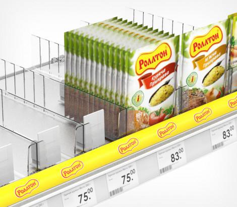 Используется передний профиль с ценникодержателем. Высота рекламной вставки - 30 мм. Имеет Т-профиль для крепления разделителей и толкателей. Крепится на полку на двухсторонний скотч.