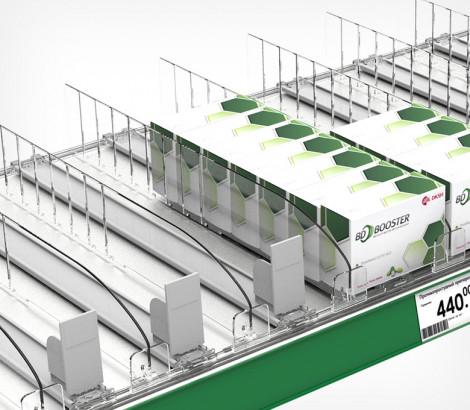 Пружинный толкатель используется для подачи товара к краю полки, а скользящая основа обеспечивает дополнительную жесткость толкателю.