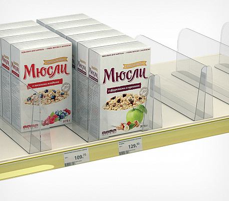 Универсальный разделитель высотой 150 мм с передним ограничителем на всю высоту разделителя,  предотвращающим падение товара с полки. Применяется для выкладки и организации крупногабаритных товаров.  Конструкция обеспечивает простоту применения.