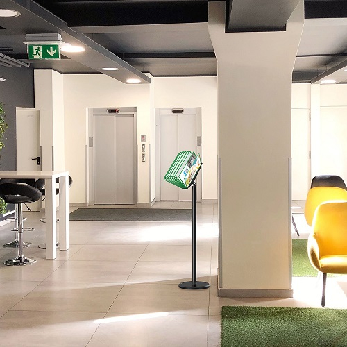 Комплект: напольное основание,  изготовлено из металла и пластика,  10 РАМ формата А-4 с встроенным защитным протектором.  Индивидуальная упаковка.