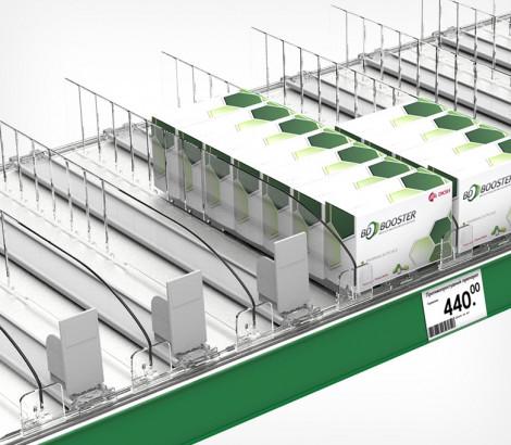 • Пластиковая задняя опора используется индивидуально или в комплекте с ребристым профилем BACKLINE. Ребристые выступы в нижней части опоры удерживают плоские упаковки товара, обеспечивая его идеальную подачу покупателю.