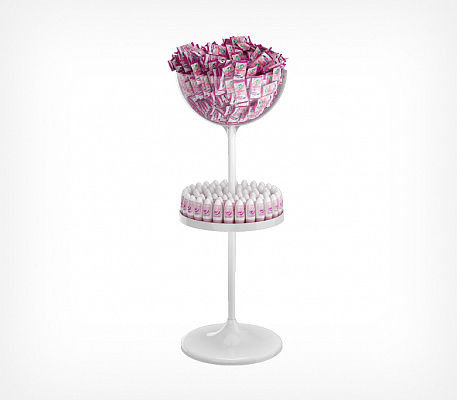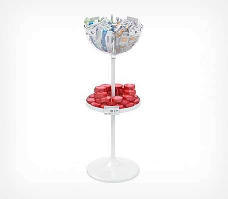 Дисплей UNIBOWL-24-RX предназначен для выкладки продовольственных и непродовольственных товаров в компактной упаковке. Позволяет делать выкладку товаров в неустойчивой упаковке в чаше и в стандартной упаковке на полке. Состав дисплея: пластиковое основание, труба длиной 520 мм, труба — 410 мм, пластиковая полка, пластиковая прозрачная чаша объёмом 24 литра, заглушка, защищающая полость трубы. Габаритные размеры: высота — 1200 мм, диаметр основания — 450 мм. Может использоваться с дополнительными опциями: информационной рамкой, ценниками, разделителями внутреннего пространства чаш, прозрачными бортиками для полки, которые приобретаются отдельно.